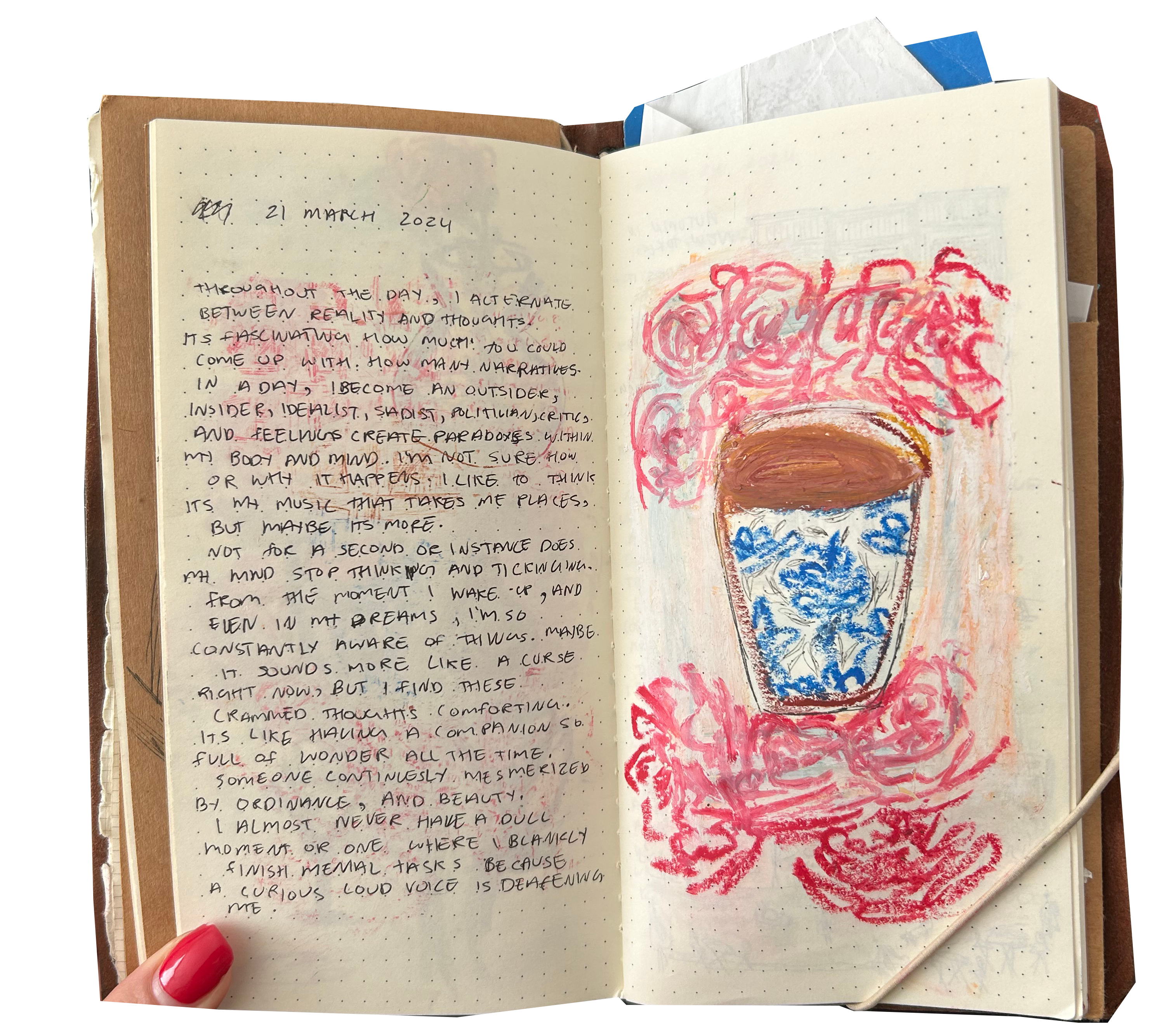 In fact, you don’t even need a journal to write in. I don’t often carry my notebook, so if I feel the itch creeping up my sweater, I would write on a napkin, a receipt, a newspaper. Even a book. Sometimes deciphering a poem is journaling. Sometimes writing two lines is enough. Sometimes you need half a book to speak. Write what you feel and think, do not neglect one for the other. Both your thoughts and feelings make you, give them space to be processed on paper.